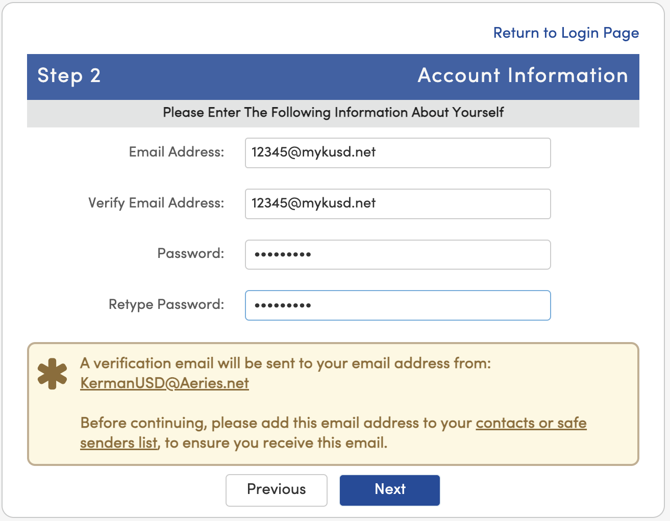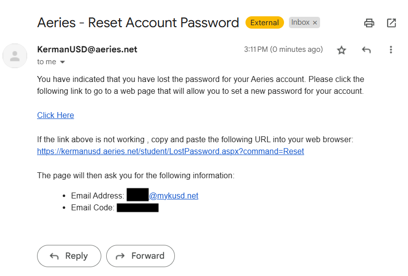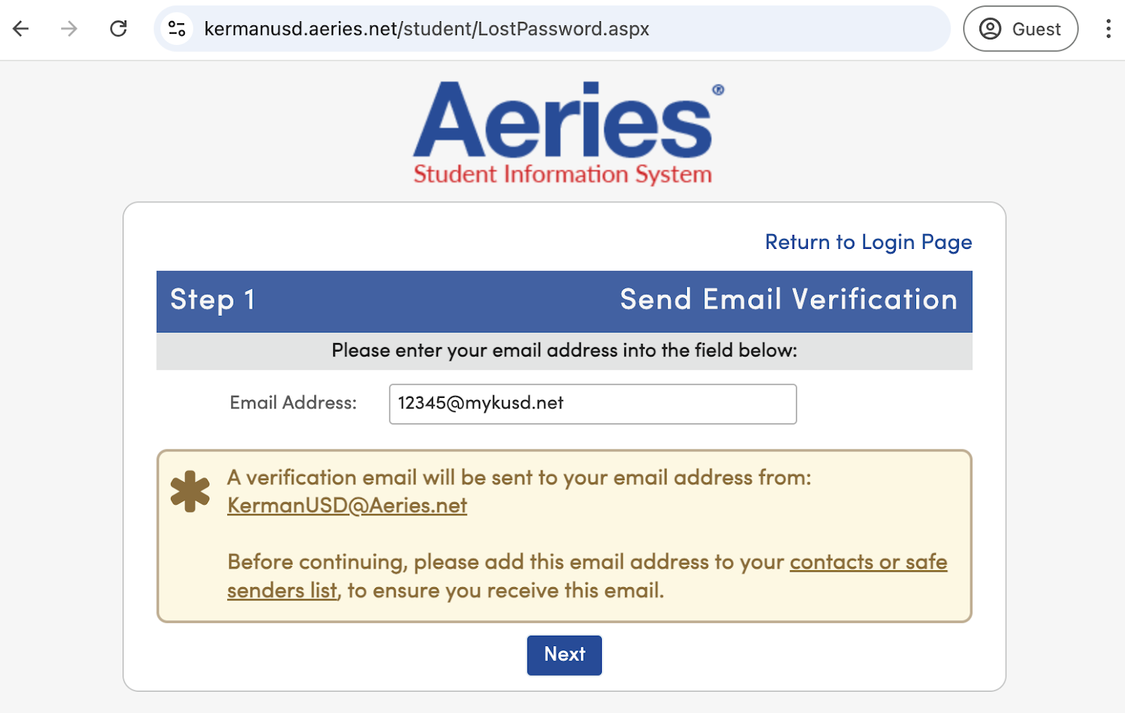 Check the student’s email for the e-mail code (Check Spam folder if necessary), if they do not receive an e-mail from Aeries after 5 minutes, Skip to Step 3